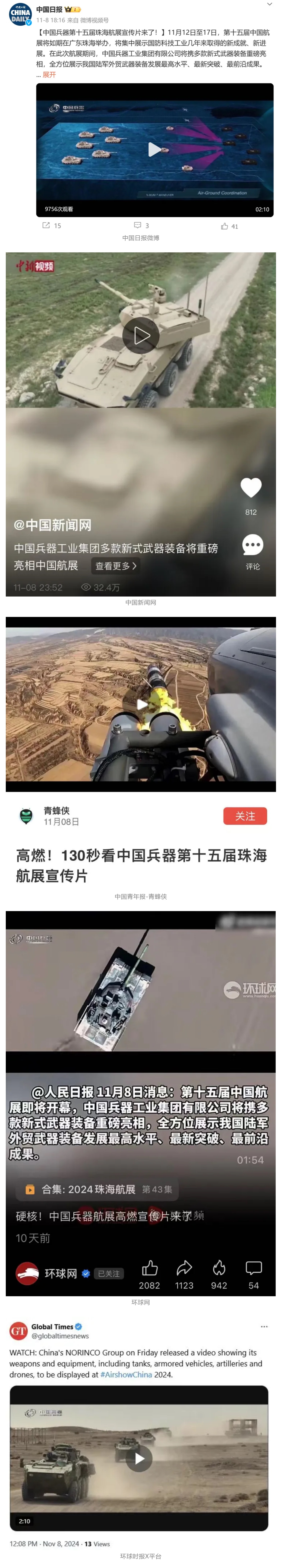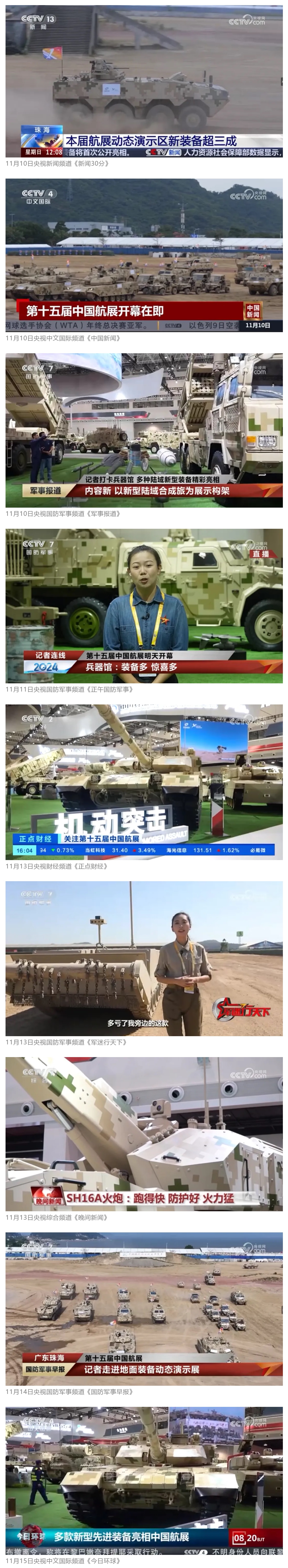 11月13日央視新聞《藍(lán)天之約》直播地面裝備動態(tài)演示此次航展,央視綜合頻道《新聞聯(lián)播》《晚間新聞》、新聞頻道《新聞直播間》《新聞30分》《朝聞天下》《共同關(guān)注》《東方時空》《午夜新聞》、財經(jīng)頻道《天下財經(jīng)》《經(jīng)濟(jì)信息聯(lián)播》《正點(diǎn)財經(jīng)》《第一時間》、中文國際頻道《今日環(huán)球》《中國新聞》、國防軍事頻道《軍事報道》《正午國防軍事》《國防軍事早報》《軍迷行天下》等欄目共播出兵器工業(yè)集團(tuán)參展相關(guān)新聞報道40余條。11月10日央視新聞頻道《新聞30分》11月10日央視中文國際頻道《中國新聞》11月10日央視國防軍事頻道《軍事報道》11月11日央視國防軍事頻道《正午國防軍事》