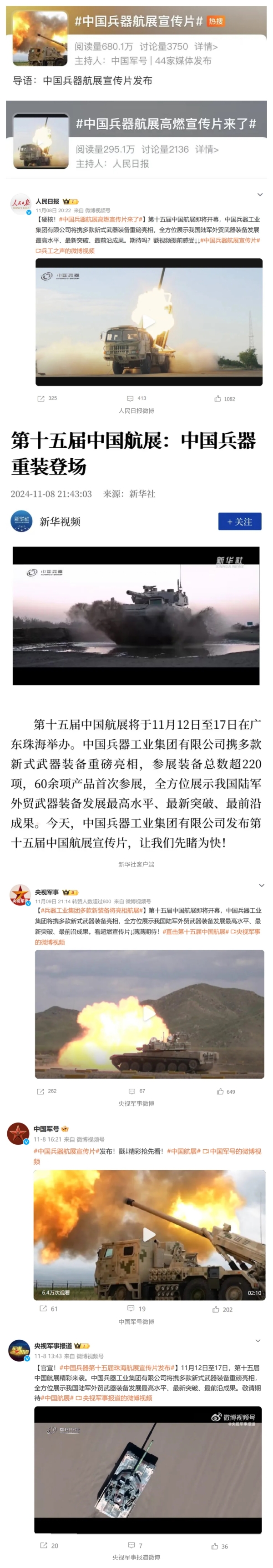 新華社、央視新聞、中央廣播電視總臺中國之聲、央視軍事、中國軍視網(wǎng)、廣東廣播電視臺等媒體以及國家國防科工局、國資小新等到兵器工業(yè)集團(tuán)地面動態(tài)演示區(qū)、中國兵器館進(jìn)行了直播。