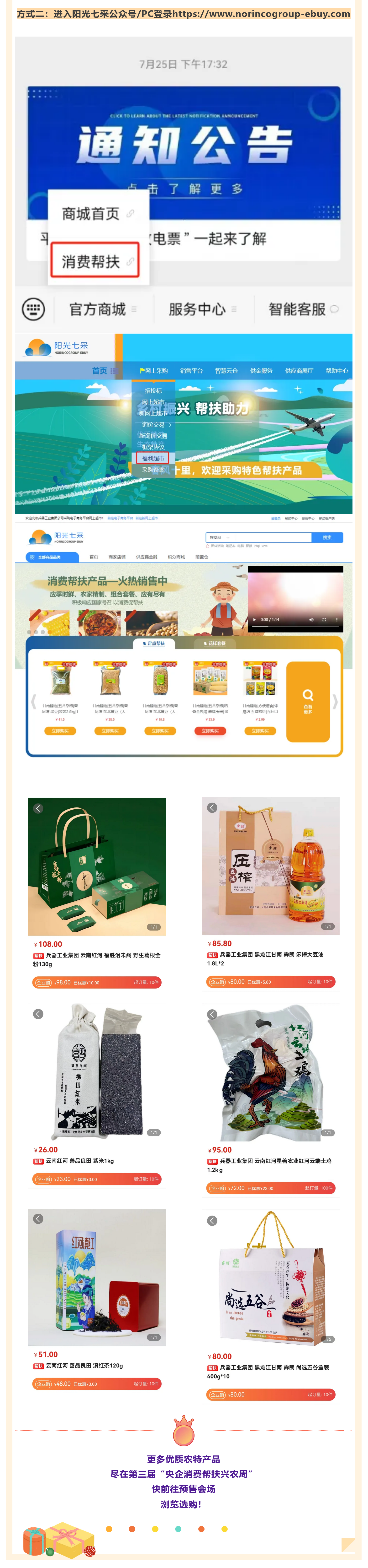 百家央企聚合力 消費幫扶促振興 第三屆“央企消費幫扶興農(nóng)周” 預(yù)售已啟動 8月30日 興農(nóng)周活動將正式開啟 “央企消費幫扶興農(nóng)周”由國務(wù)院國資委社會責(zé)任局指導(dǎo),央企消費幫扶電商平臺(國網(wǎng)數(shù)字科技控股有限公司)主辦,國務(wù)院國資委機關(guān)服務(wù)管理局、國務(wù)院國資委新聞中心、國網(wǎng)北京市電力公司、各中央企業(yè)電商平臺聯(lián)合協(xié)辦。 活動以“央企攜手,興農(nóng)惠民”為主題,組織動員中央企業(yè)所屬各單位各部門(特別是工會、食堂)、廣大干部職工、上下游供應(yīng)商和業(yè)務(wù)合作伙伴采購幫扶縣的優(yōu)質(zhì)農(nóng)產(chǎn)品,促進(jìn)脫貧地區(qū)產(chǎn)業(yè)發(fā)展和脫貧群眾穩(wěn)定增收,鞏固拓展脫貧攻堅成果。 預(yù)售活動火熱開啟 為方便大家提前選購 此次預(yù)售期升級為10天 (8月20日-8月29日) 誠邀下單 兵器工業(yè)集團(tuán)定點幫扶 黑龍江甘南縣、云南紅河縣 農(nóng)特產(chǎn)品! 8月30日-9月5日 請鎖定“央企館-兵器工業(yè)集團(tuán)” 我們一起共譜鄉(xiāng)村振興新篇章! |