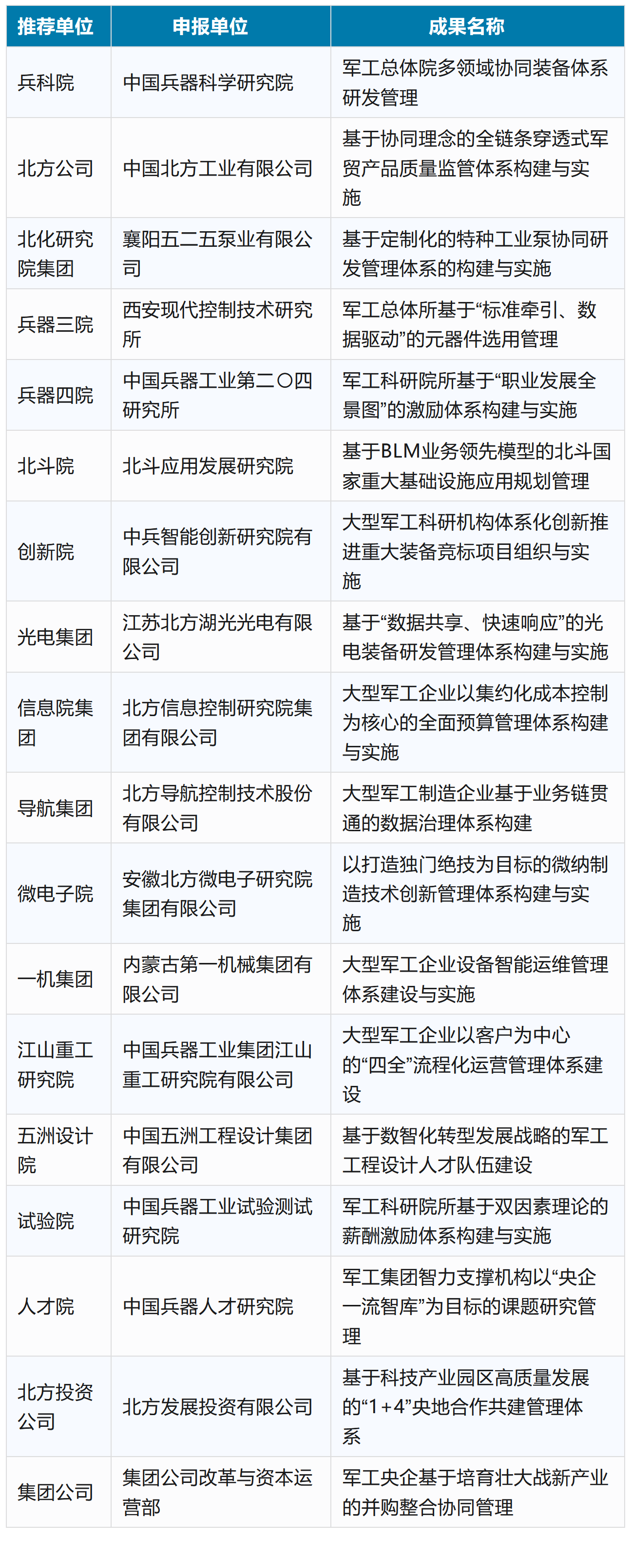為促進(jìn)管理創(chuàng)新和改革發(fā)展,引導(dǎo)各單位在管理實(shí)踐中運(yùn)用現(xiàn)代管理科學(xué)理論和方法,創(chuàng)新經(jīng)營理念,革新管理制度,改進(jìn)管理方式、管理組織、管理方法,營造鼓勵(lì)創(chuàng)新、尊重知識(shí)、尊重實(shí)踐、尊重人才的創(chuàng)新環(huán)境。中國兵器工業(yè)集團(tuán)有限公司組織開展了2025年度管理創(chuàng)新成果的申報(bào)、推薦與審定工作。經(jīng)初審、初評、答辯及終審、公示等環(huán)節(jié),最終評出獲獎(jiǎng)成果91項(xiàng),其中:一等獎(jiǎng)18項(xiàng)、二等獎(jiǎng)24項(xiàng)、三等獎(jiǎng)49項(xiàng)。 兵器工業(yè)集團(tuán)2025年度一等獲獎(jiǎng)成果名單