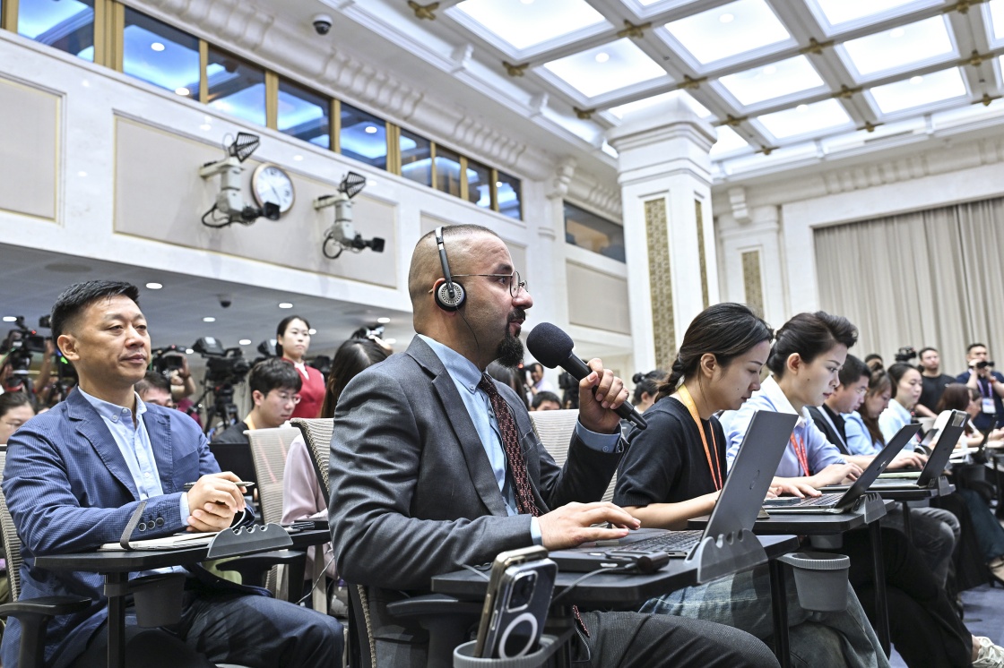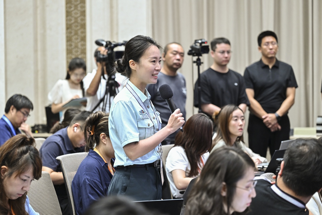 8月20日,國務(wù)院新聞辦公室在北京舉行新聞發(fā)布會(huì),閱兵領(lǐng)導(dǎo)小組辦公室副主任、中央軍委聯(lián)合參謀部作戰(zhàn)局少將副局長(zhǎng)吳澤棵,中國人民解放軍中部戰(zhàn)區(qū)閱兵指揮機(jī)構(gòu)辦公室常務(wù)副主任、政治工作部少將副主任徐貴忠介紹閱兵準(zhǔn)備工作有關(guān)情況,并答記者問。這是記者在現(xiàn)場(chǎng)提問。